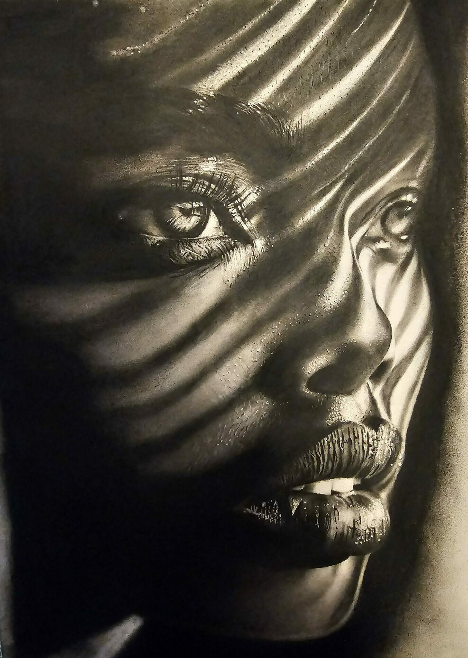 Nouvelle Frida, regard sur soi, bienveillant si possible. Remise en question,  se recentrer aussi. Ce portrait éveille la curiosité ! Bonne réflexion ! Pierre noire.